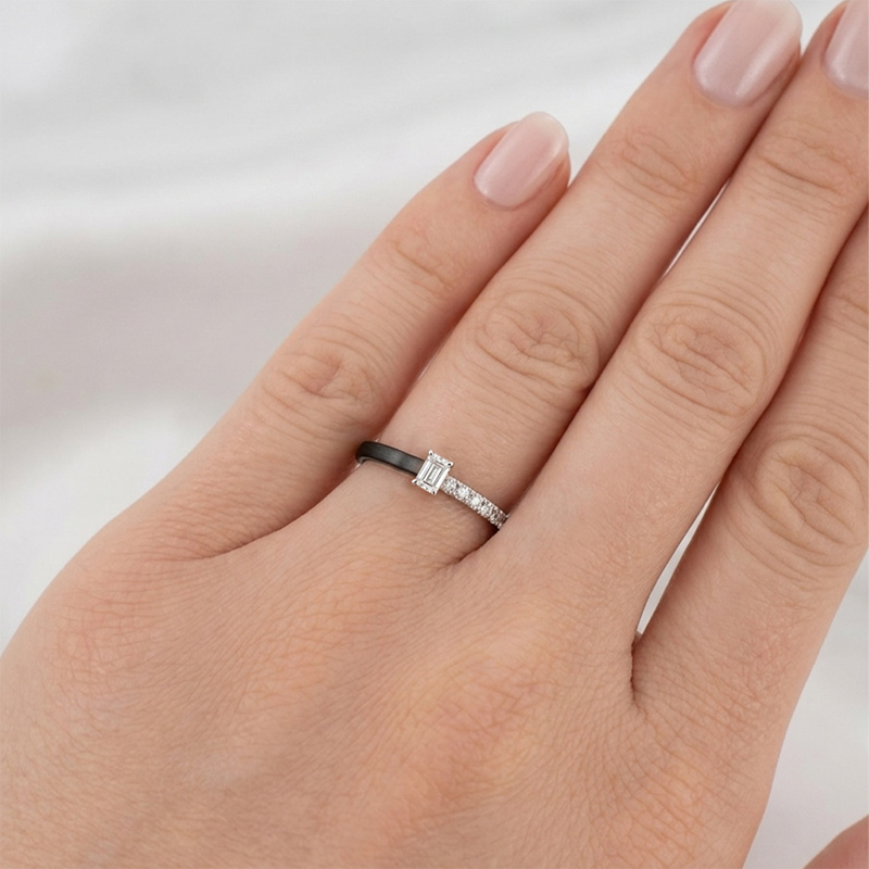 - Kamene: 0,09 ct brilianty (13ks) TW-si, 0,22 ct centrálny diamant so smaragdovým výbrusom, 0,05 ct email
