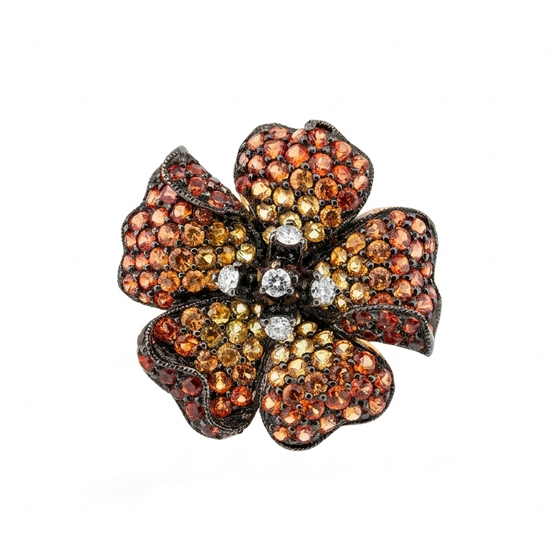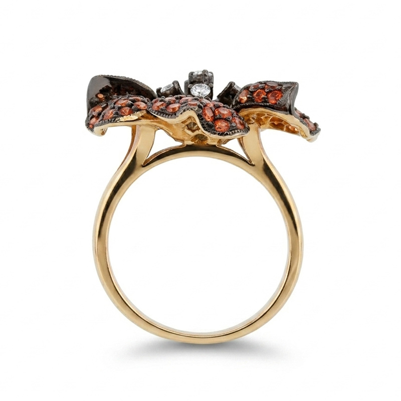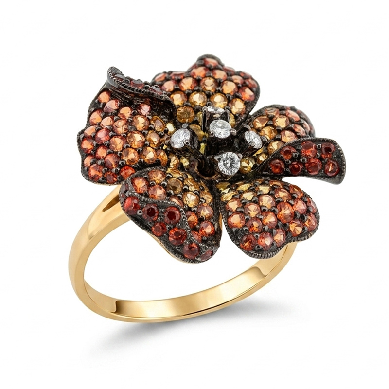 Elegantný prsteň vyrobený z 14-karátového žltého a čierneho zlata s diamantmi a viacfarebným zafírom, ktorý vyžaruje jedinečnú noblesu a vycibrený vkus. Tento prsteň predstavuje dokonalú kombináciu elegancie a jemného lesku, vďaka čomu je výrazným doplnkom na každú príležitosť. Šperk je súčasťou kolekcie Flowers.