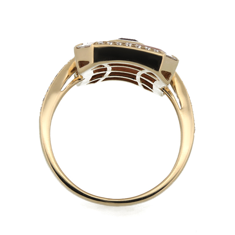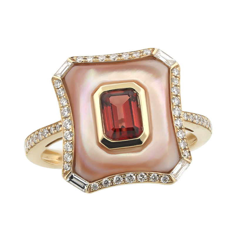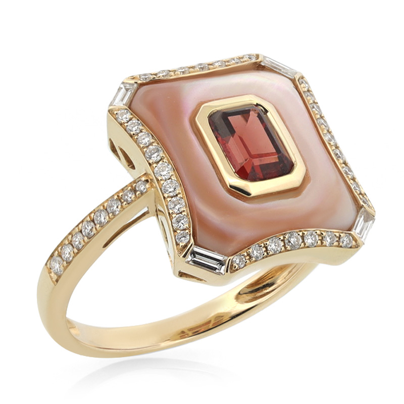 Briliantový prsteň zo žltého 14-karátového zlata s granátom a perleťou