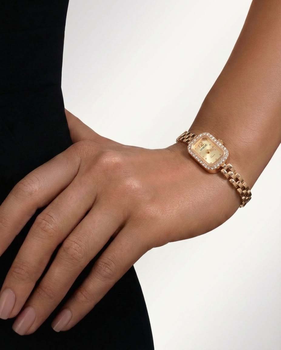 Elegantné hodinky vyrobené z pravého 14-karátového žltého zlata s puncovou značkou kvality. Pochádzajú z Talianska a ich unikátny tvar kombinuje obdĺžnikové a zaoblené línie.