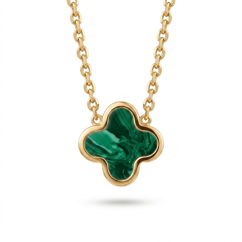 Náhrdelník štvorlístok zo žltého 14-karátového zlata s malachitom