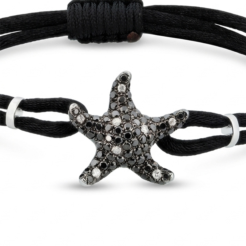Náramok s čiernou šnúrkou z bieleho 18-karátového zlata s čiernymi briliantmi