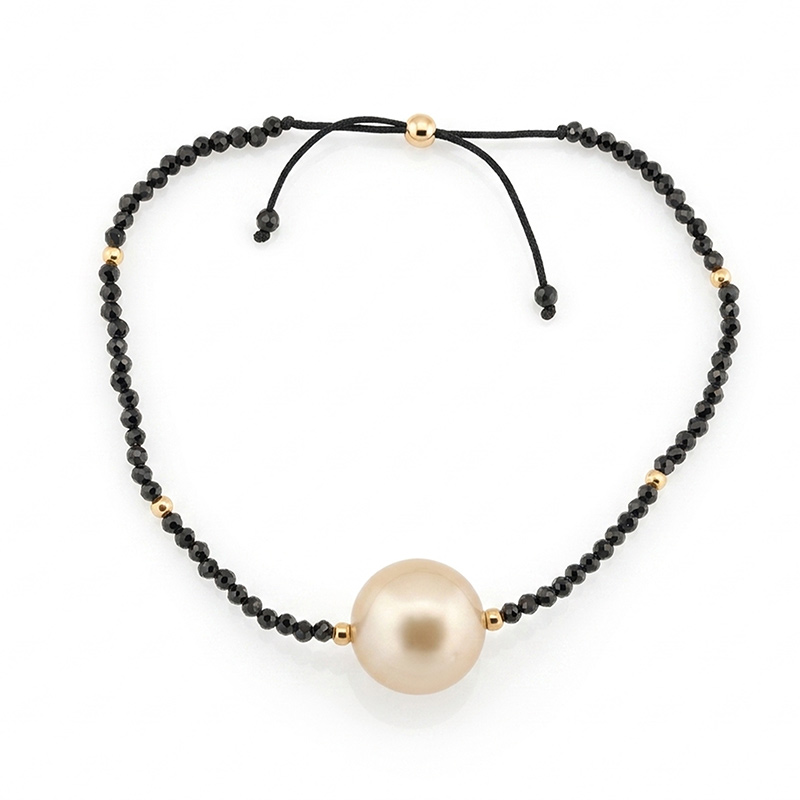 - Kamene: 62 ks Spinel, spolu 9,30 ct, farba čierna. 1 ks morská perla South Sea, zlatistá farba, priemer 12 mm