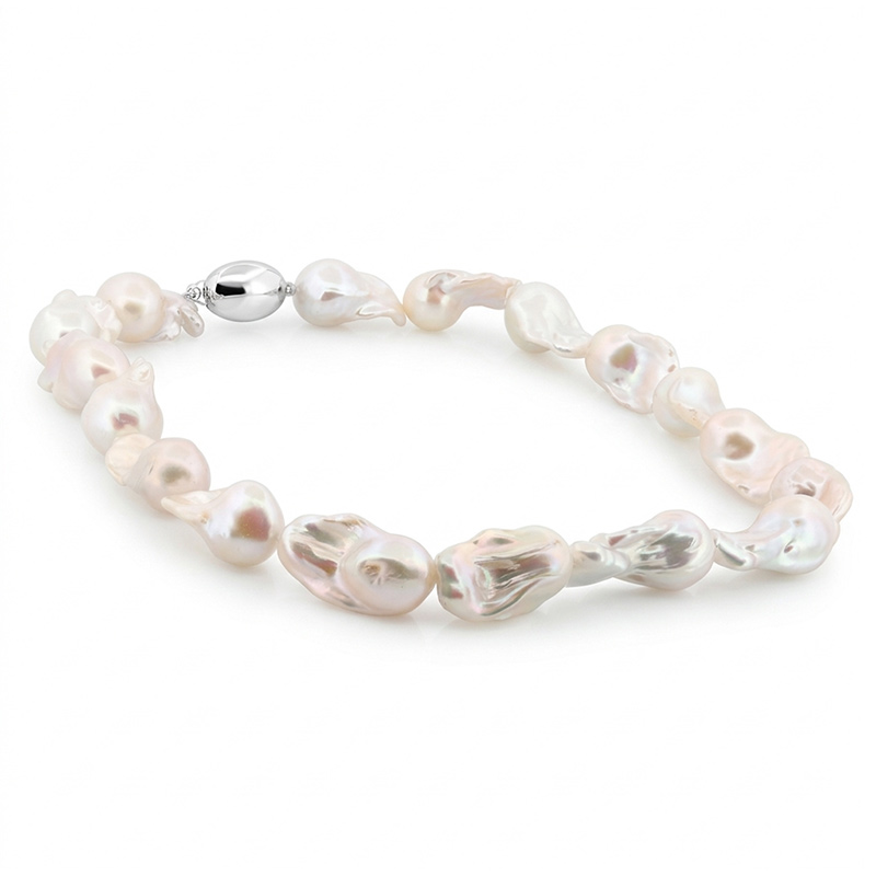 Tento nádherný náhrdelník tvorí súbor veľkých barokových sladkovodných perál s veľkosťou 13–14 mm, z ktorých každá má jedinečný organický tvar a žiarivý lesk. Výrazný a elegantný kúsok, ktorý predstavuje nadčasový šperk oslavujúci prirodzenú krásu barokových perál.