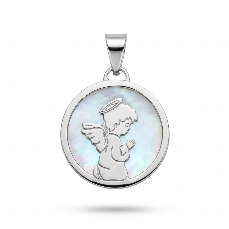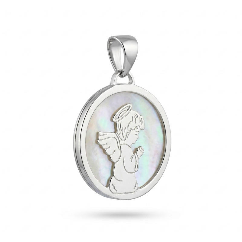 Prívesok anjel z bieleho 14-karátového zlata s perleťou