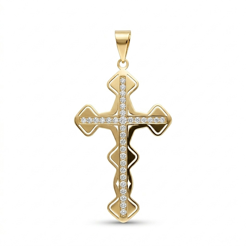 Prívesok krížik zo žltého 14-karátového zlata so zirkónom