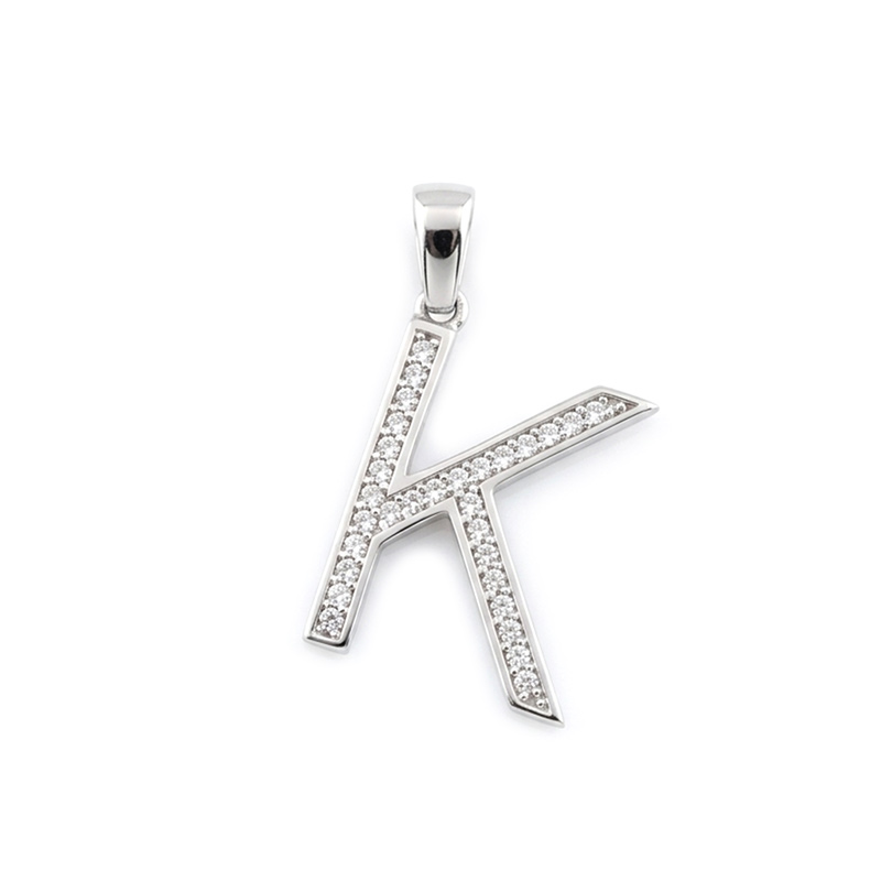 Prívesok písmeno „K“ z bieleho 14-karátového zlata so zirkónom